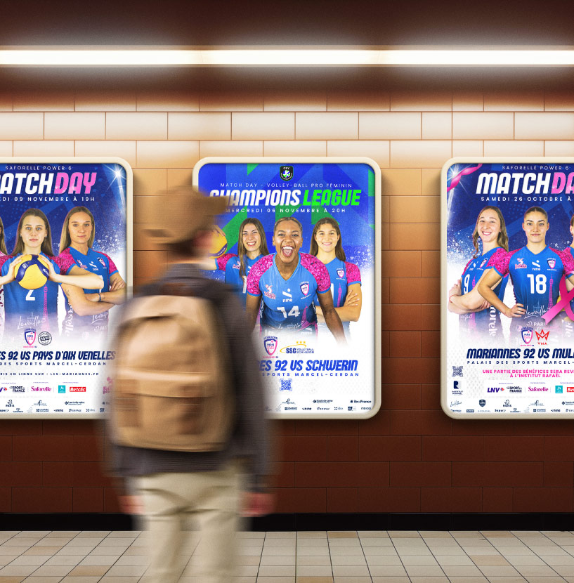 Tcheel a conçu une gamme de supports print pour les Mariannes 92 afin de renforcer leur communication et leur image. Affiches de matchs, roll-ups, backdrops et programmes de match : chaque visuel a été pensé pour offrir une cohérence graphique forte et une mise en avant impactante des événements du club.