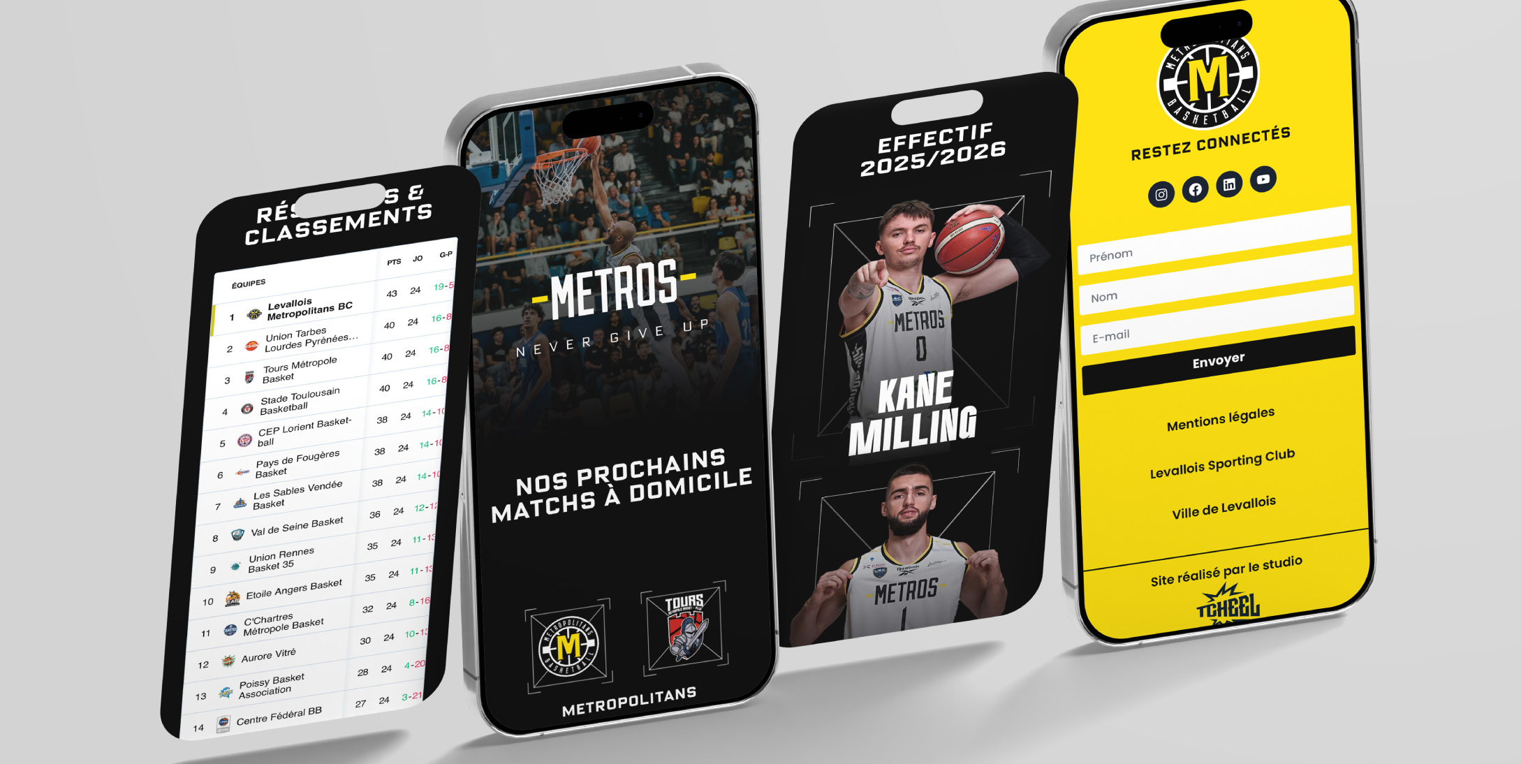 Tcheel a réalisé le site web des Métropolitans Basketball Club, offrant une plateforme dynamique pour suivre l’actualité du club. Le site met en avant les matchs à venir, présente l’équipe et permet aux supporters d’accéder facilement aux informations clés et la billetterie.