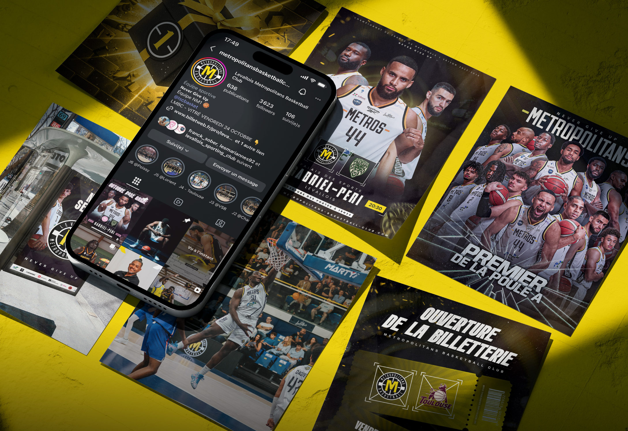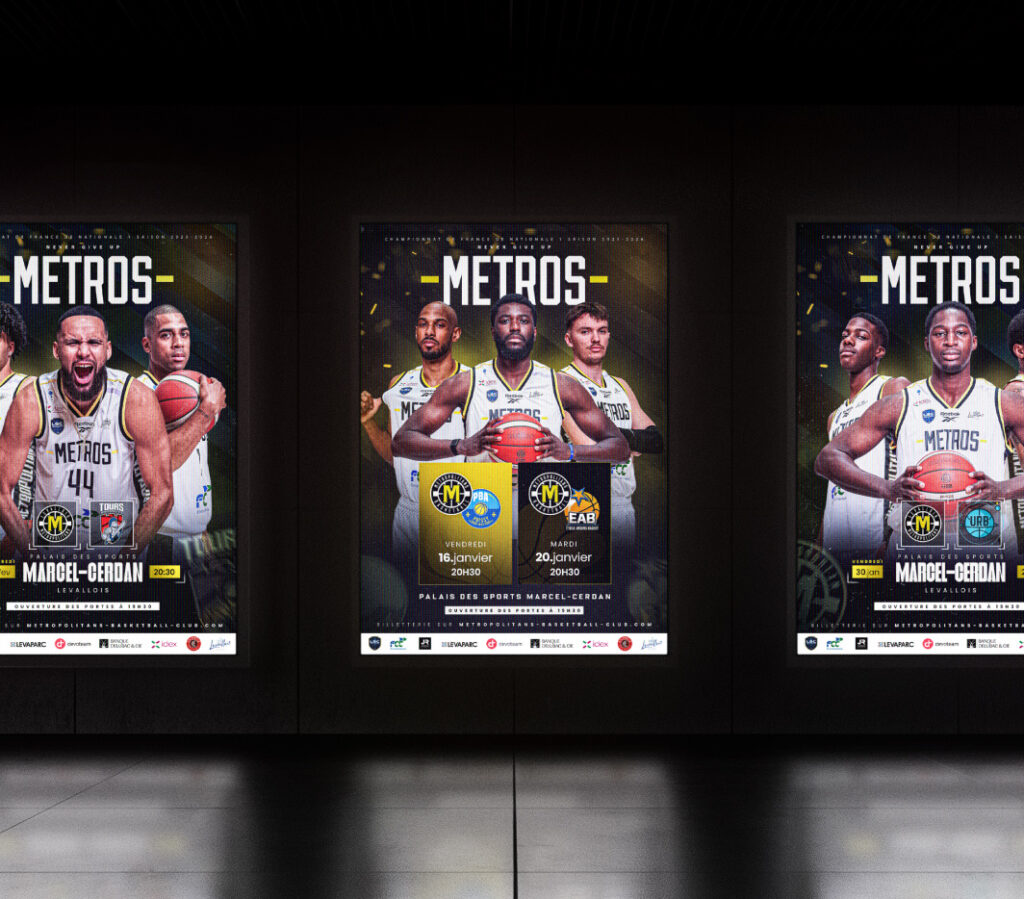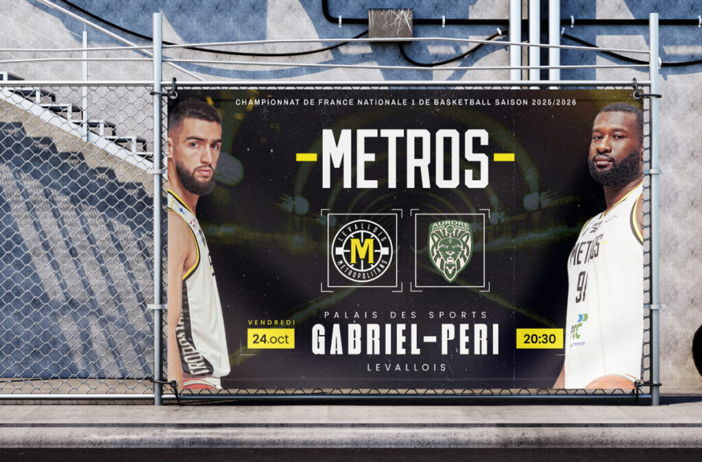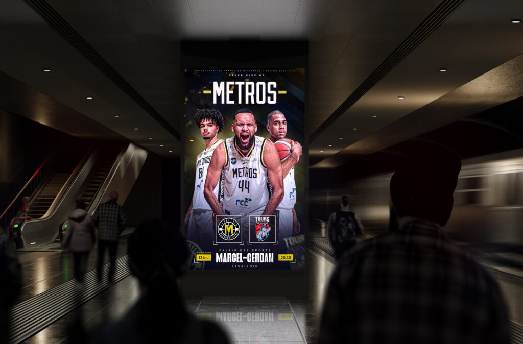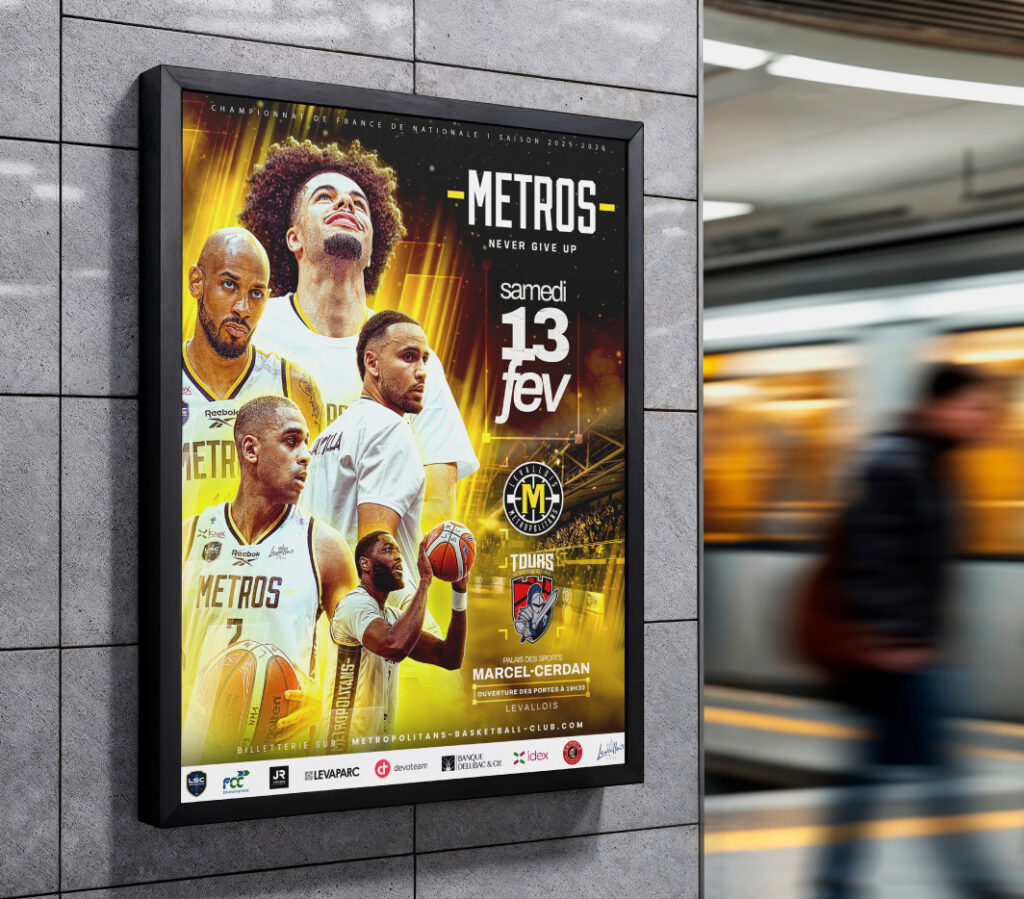 Tcheel a conçu les affiches officielles des matchs des Métropolitans Basketball Club, alliant impact visuel et identité forte du club. Ces créations mettent en avant les rencontres de la saison, renforçant l’engouement des supporters et la visibilité des événements.
